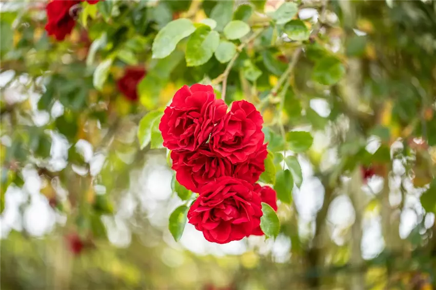 Kletterrose, rot Rosen sind nicht nur wunderschön, sie sind auch genauso vielfältig. Deshalb lassen sich nur mit Rosen ganze Gärten gestalten, ohne, dass andere Pflanzen benötigt werden. Wer einen Rosengarten gestalten möchte, hat die Wahl zwischen den unterschiedlichsten Arten und unzähligen Sorten. Besonders beliebt am altbekannten Rosenbogen: die Kletterrose. Mit ihr kann man grauen Mauern neuen Glanz verleihen, Rankhilfen bunter gestalten oder ganze Hauswände und Sichtschutzwände begrünen. Niemand klettert so hoch, wie die Kletterrose. Und dabei ist sie noch äußerst pflegeleicht und braucht in der Regel keinen Rückschnitt. Ebenfalls beliebt sind Wildrosen. Sie versprühen einen ganz besonders natürlichen Charme und machen auch im Bauerngarten eine sehr gute Figur. Die Blüten in den unterschiedlichsten Farben verströmen einen angenehmen und charakteristischen Duft und locken damit auch Bienen und andere Nützlinge an. Einen Rosengarten gestalten sorgt also auch noch für ein gesundes Ökosystem. Neben diesen Schätzen sind auch besondere Züchtungen der Edelrosen ein echtes Highlight. Sie haben die charakteristischen Blüten und sind im Garten ein echter Hingucker. An denen kommt einfach kein Rosengarten vorbei.