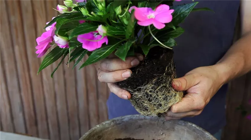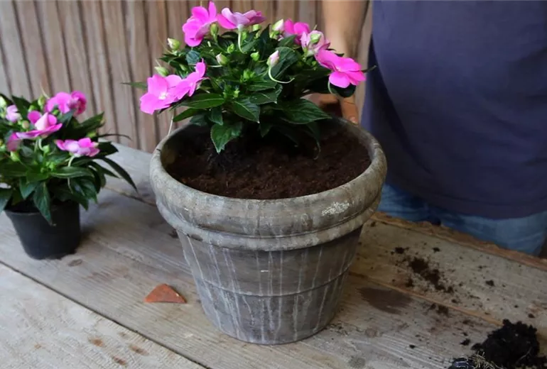 Wenn Sie die Edellieschen in ein größeres Gefäß umsetzen, entfernen Sie zunächst den alten Topf, damit die Pflanzen neue Wurzeln bilden können und sich so optimal mit Wasser und Nährstoffen aus der neuen Erde versorgen können.